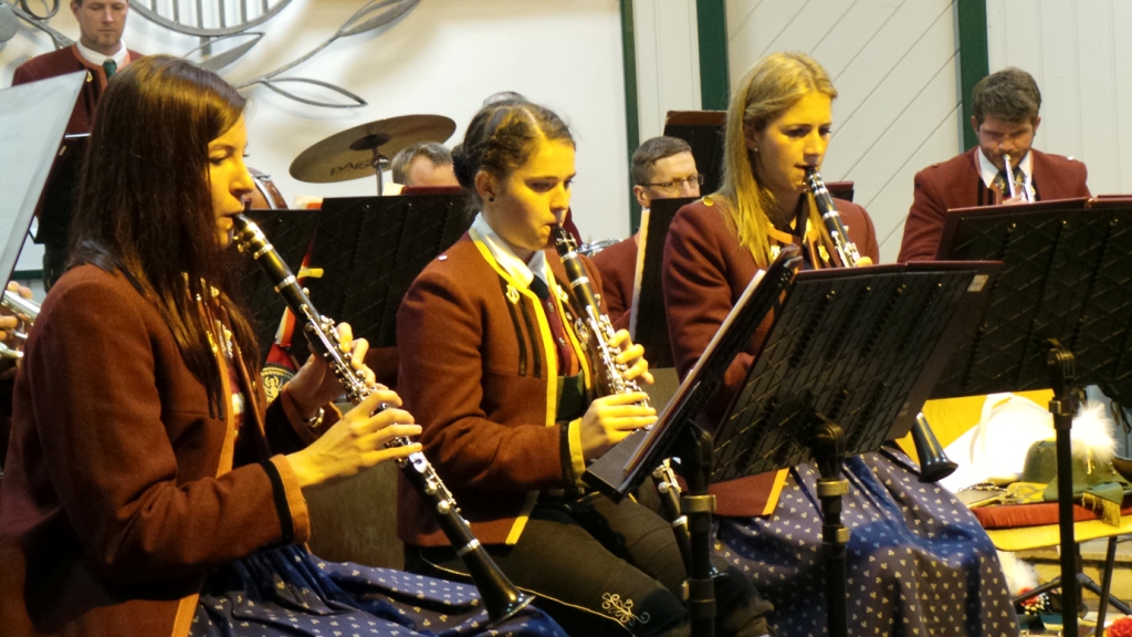 Dem regnerischen Wetter trotzten… … die Birgitzer Musikantinnen und Musikanten am Donnerstag, 20. August 2015, anlässlich ihres Gastkonzertes bei uns in Kössen. Nichtsdestotrotz ließen sich auch die Zuhörer vom nassen Wetter nicht beirren und genossen die stimmungsvolle Atmosphäre auf dem Dorfplatz. Zwischen unserer Obfrau Susanne Straif und ihrem „kleinen Bruder“, Thomas Rampl, dem Kapellmeister der Birgitzer, wurden die Konzerttermine bereits im Vorjahr festgelegt. Leider abgesagt und auf nächstes Jahr verschoben werden musste das für den Juni terminisierte Konzert der MK Kössen in Birgitz aufgrund des äußerst schlechten Wetters. Feierlich eröffnet wurde das Gastkonzert mit der „Fun Fare“, einer Komposition unseres Kapellmeisters Martin Scharnagl, und damit war auch schon der musikalische Bogen gespannt und setzte sich fort mit der Ouvertüre „Der Waldsänger“ , dem Walzer „Sagen aus Alt-Innsbruck“, sowie heitere Polkas und flotte Marschklänge gehörten zum abwechslungsreichen Repertoire. Die beiden hübschen Marketenderinnen Theresa und Anna Abenthung erkannten sehr bald das rege Interesse am mitgebrachten Schnaps, besonders unter den Kollegen der Musikkapelle Kössen. Mit dem Edelweiß-Marsch neigte sich das Konzert dem Ende und der herzliche Applaus lockte noch einige Zugaben aus den Musikerinnen und Musikern heraus.